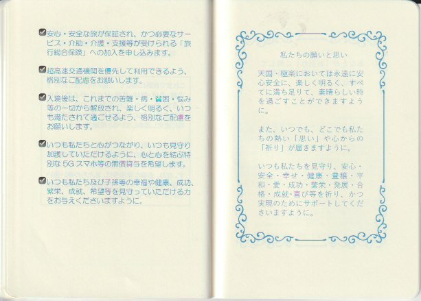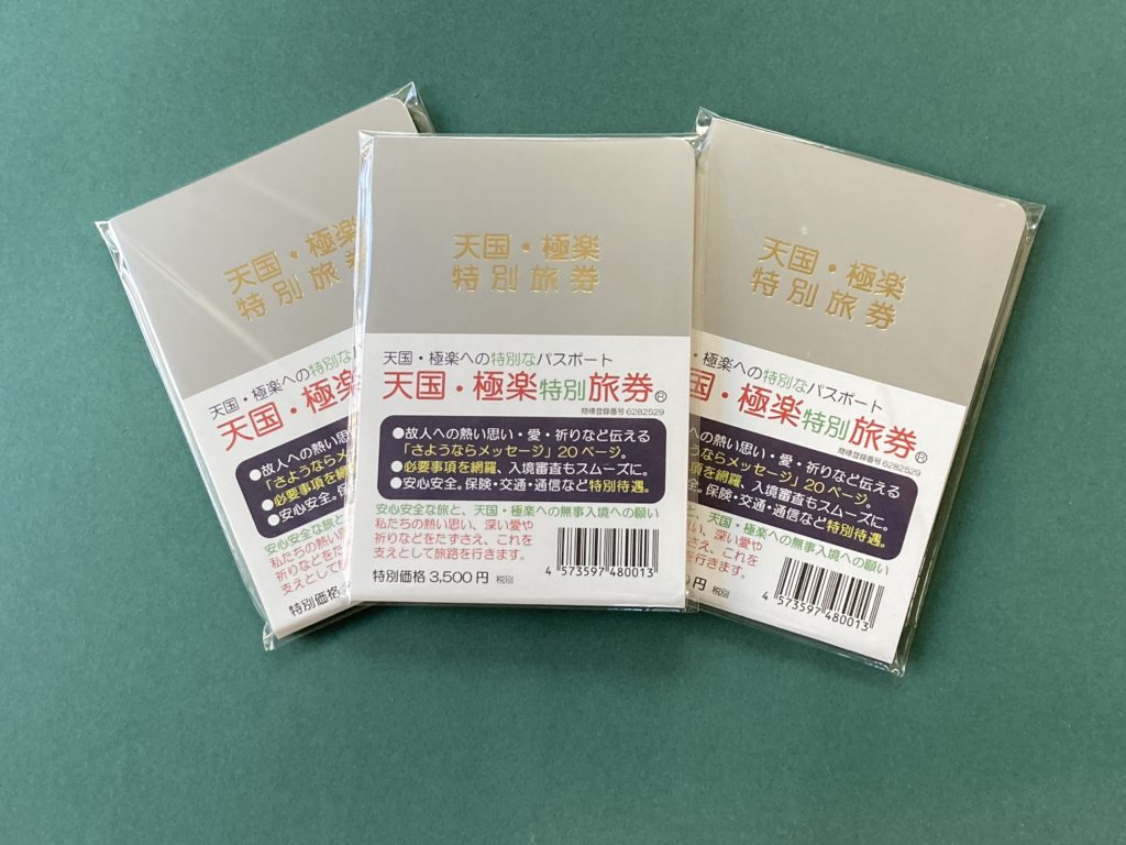 「天国・極楽特別旅券」は天国・極楽への安全安心な旅と天国・極楽への無事入境を願い世界で初めて、日本で初めて生まれました。しかも単なるパスポートではなく、大勢の人たちの熱い思い、深い祈りが込められた特別なPASSPORTです。